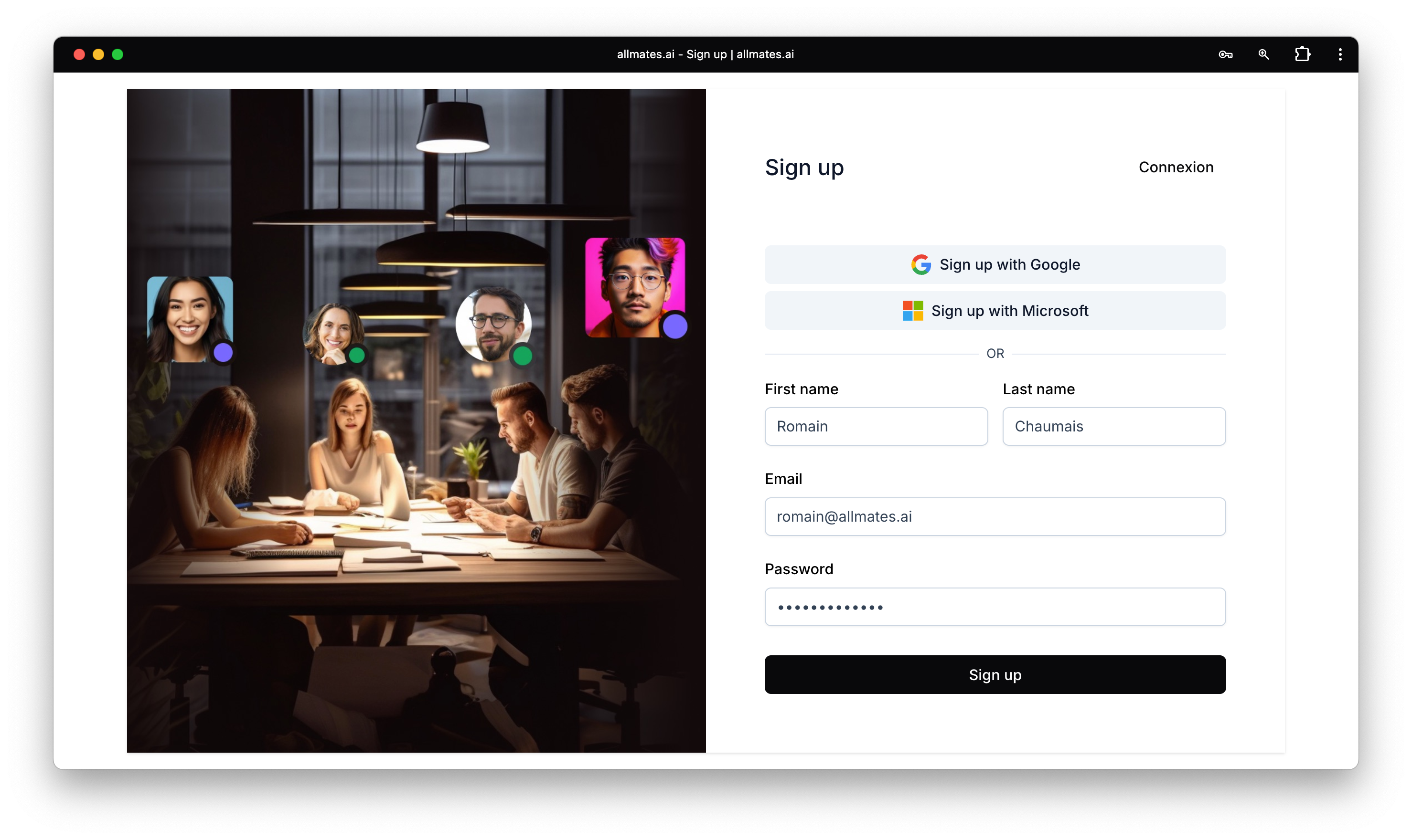 Google Account: Click "Sign up with Google". Choose your Google account and authorize allmates.ai. This is often the fastest method if you use Google Workspace or Gmail.