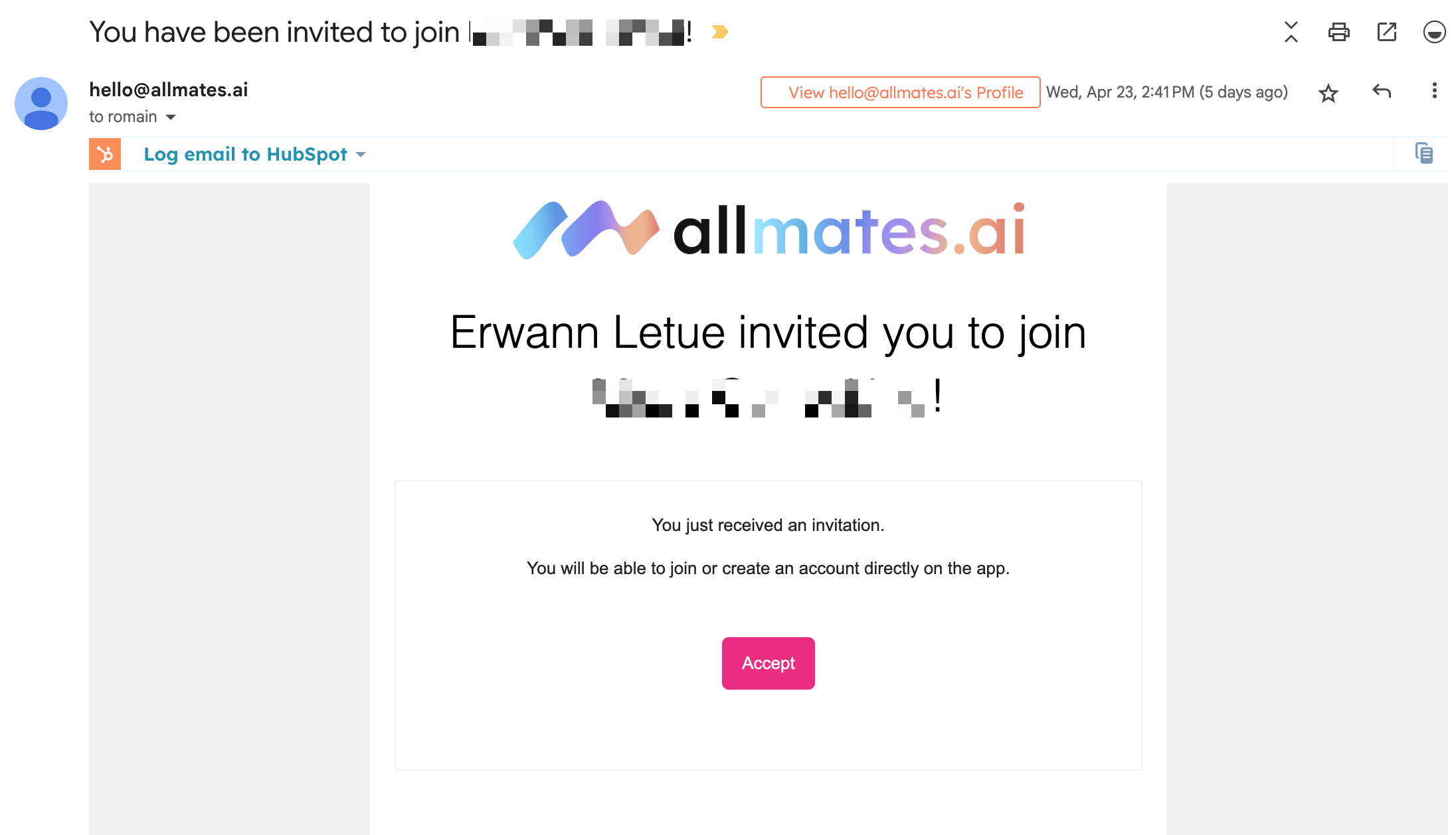 Accepting an Invitation: If a colleague invited you, click the "Accept" button in the invitation email you received from hello@allmates.ai. This will take you to allmates.ai. If you already have an account with that email, log in. If not, you'll be prompted to create one using the Email or Google method above. You'll automatically join the organization that invited you.