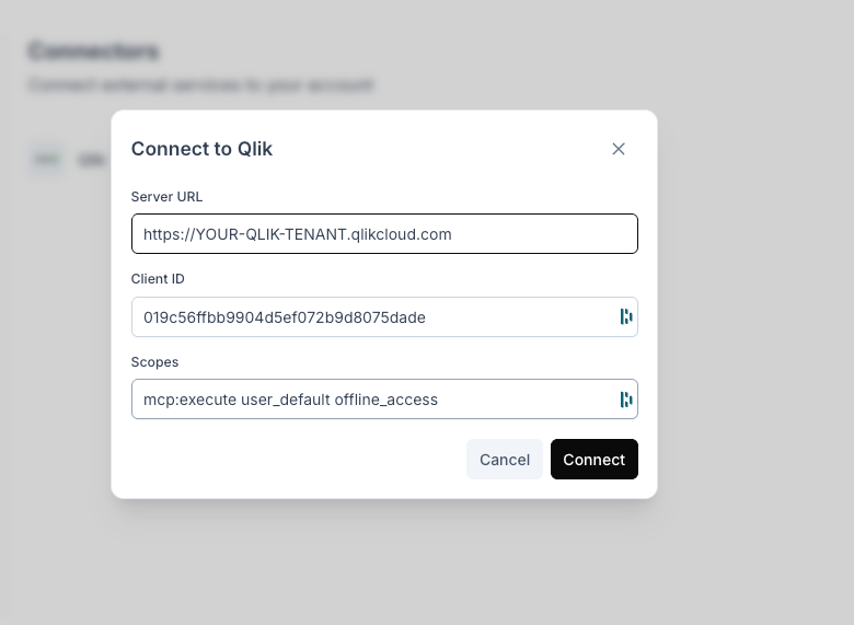 Each user who wants to use the Qlik MCP server tool through a mate MUST first connect to a Qlik tenant though the Allmates Qlik OAuth connector.